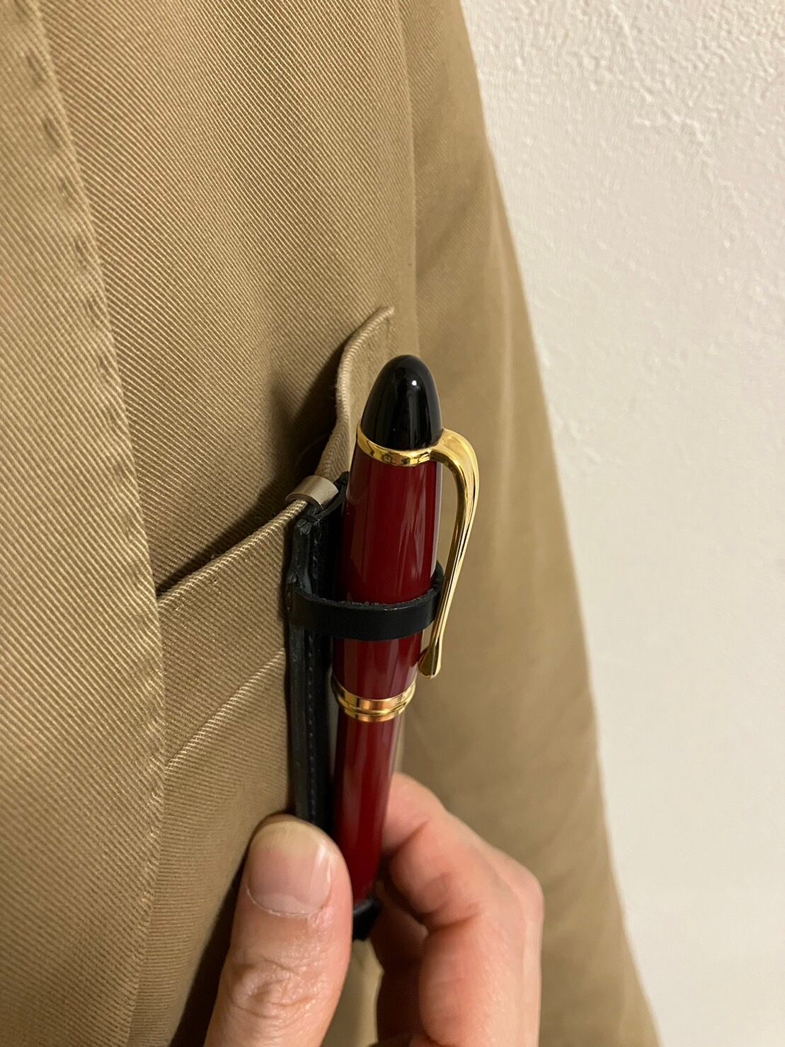 このペンホルダーは、ジャケットやスーツの上着の左胸ポケットにさすことを想定しております。他の衣類のポケットや鞄等のポケットにさすと、ペンホルダーの落下や破損、落下によるペンの破損又は衣類のたわみの原因となりますのでお止めください。